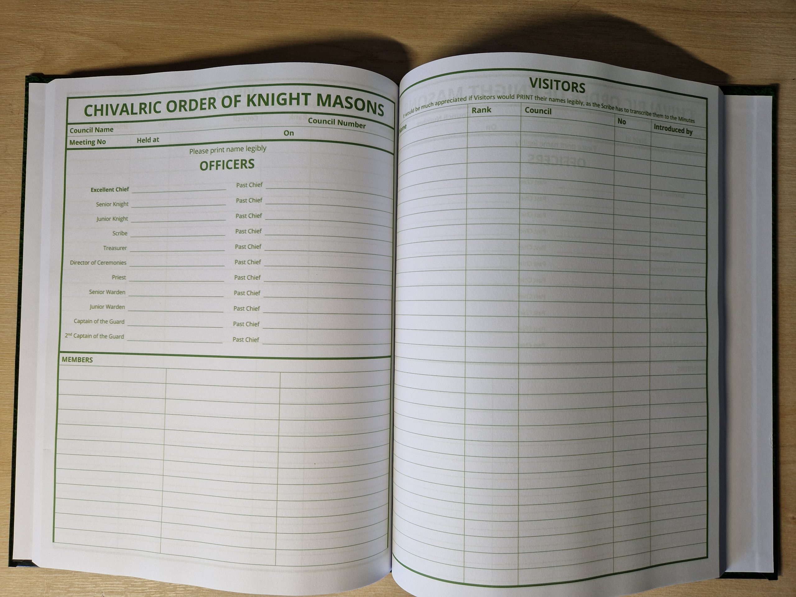 Council of Knight Masons Attendance Register / Signing in book (202 pages). Suitable for most Councils on current guidelines. Spaces for Council Officers, Visitors & Guests.