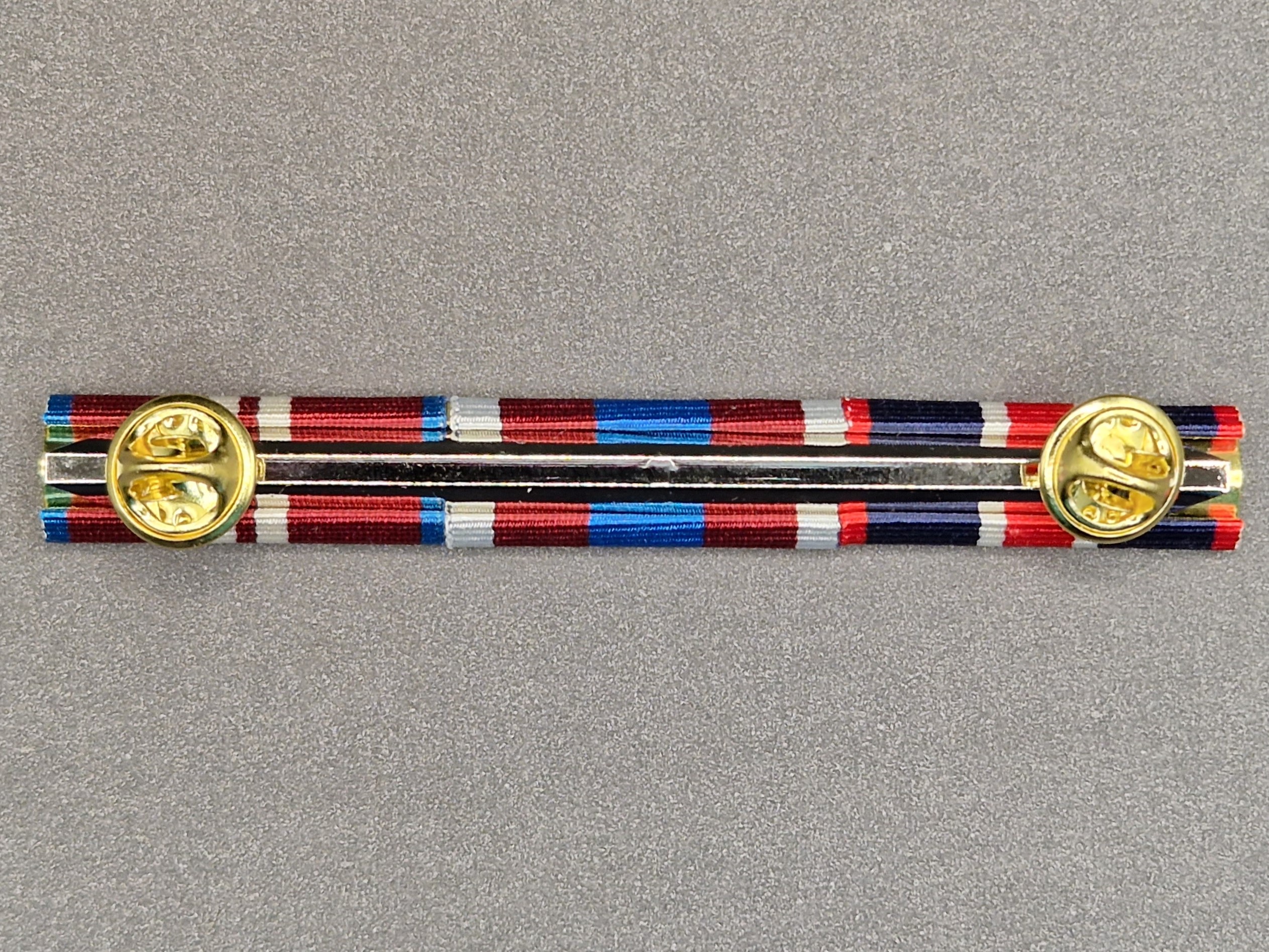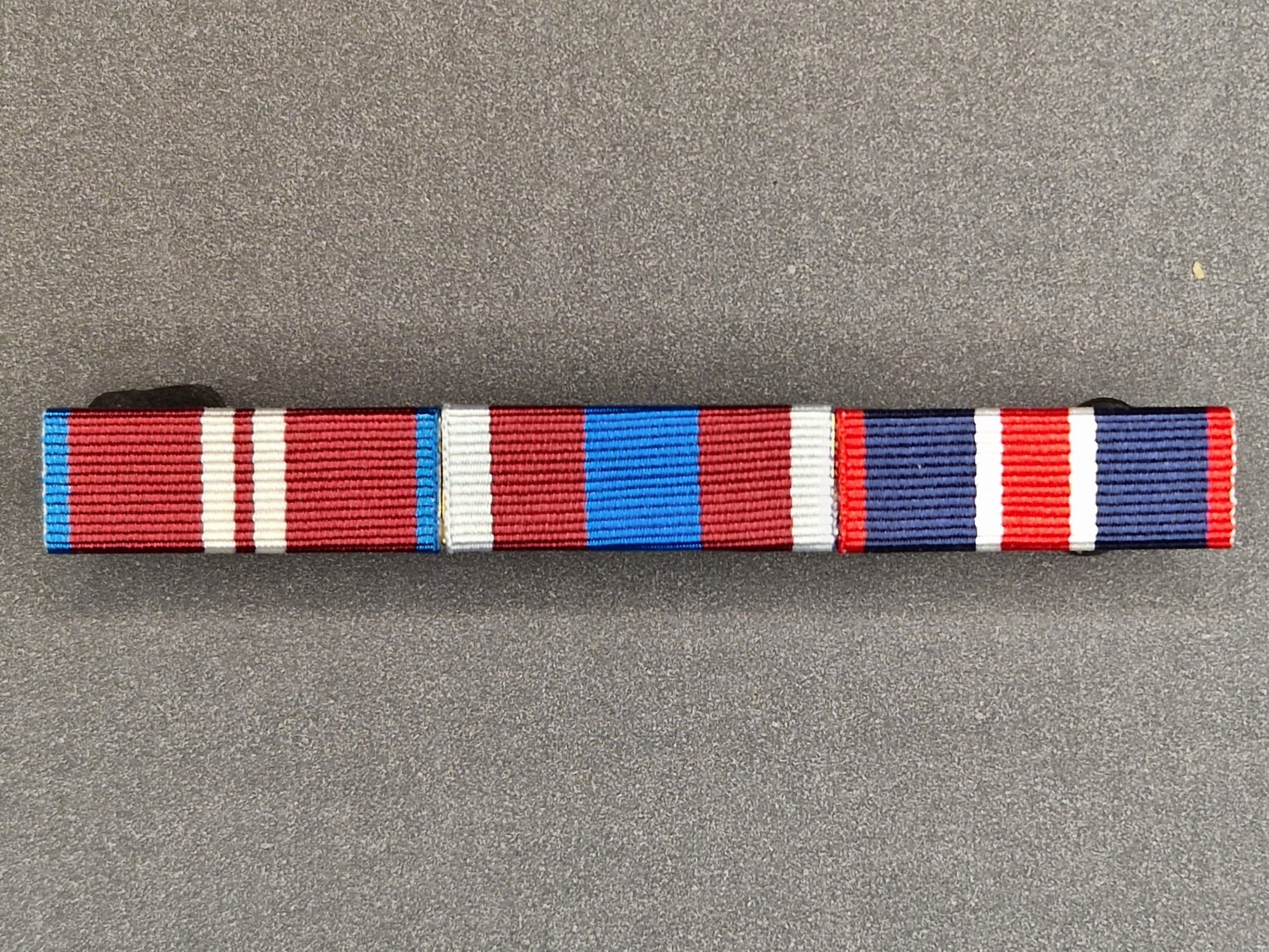 Description – Royal blue with central red stripe bordered with two thin white stripes, the ribbon also edged with two thin red stripes