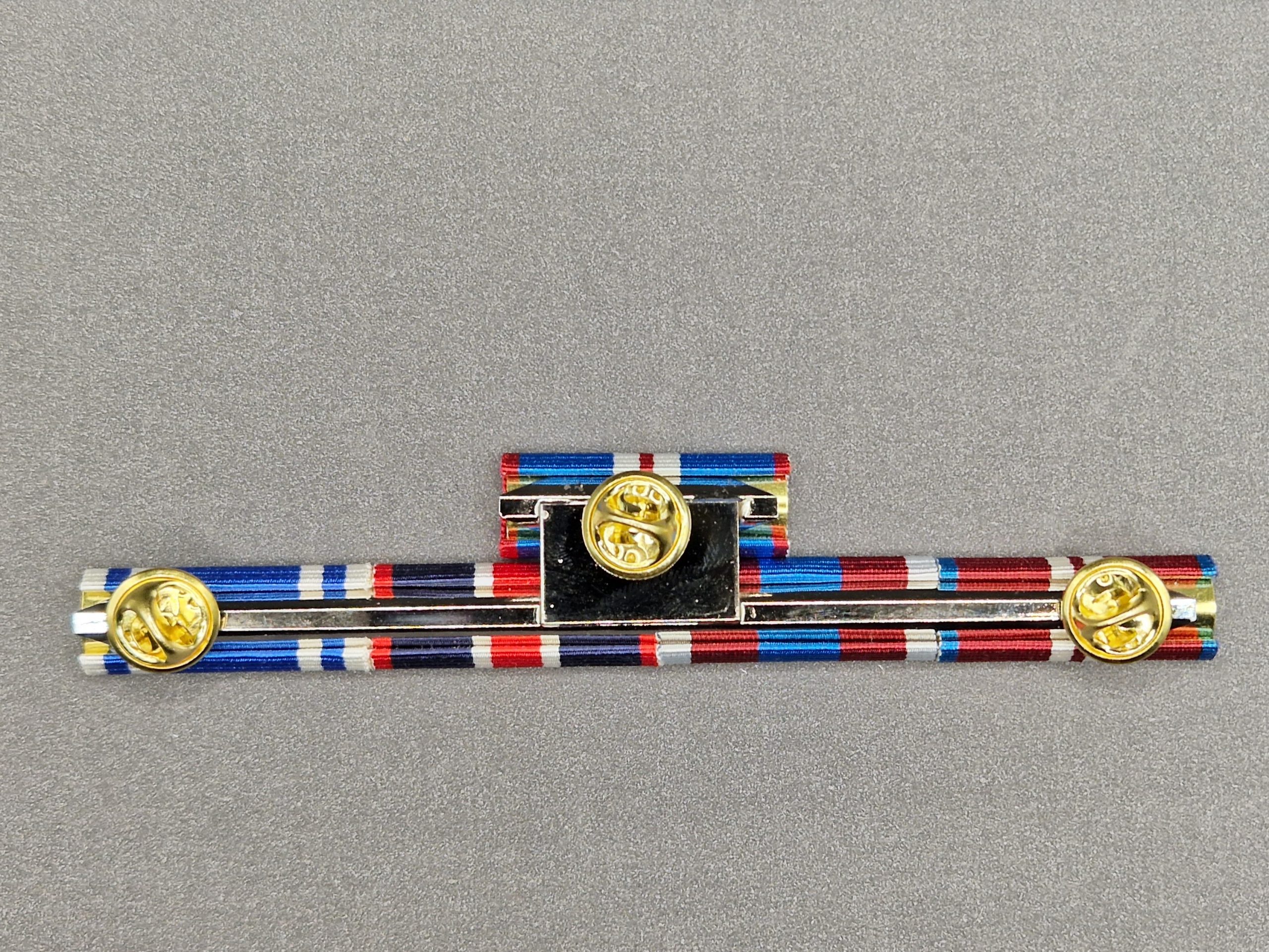 Description – Royal blue with central red stripe bordered with two thin white stripes, the ribbon also edged with two thin red stripes