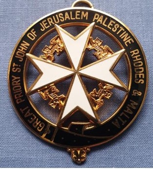A quality item, this Knights of Malta Great Priory Collarette jewel is manufactured with a combination of white hard enamelled Maltese Cross and gilt plated lions and letters.